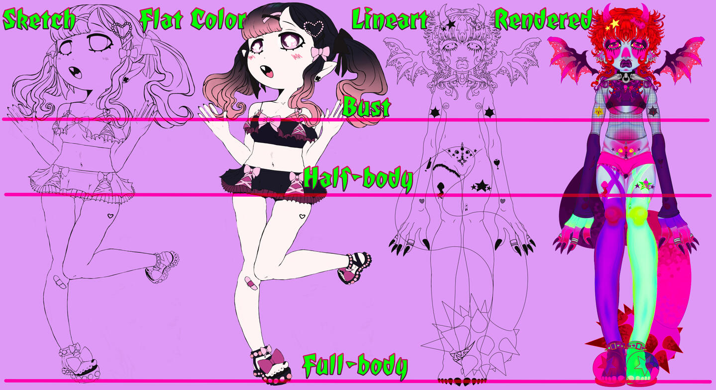 • Commissioned works may be shown as examples for my portfolio/job listings. If you do not wish for your commission to be shown publicly before a certain date, please specify beforehand.